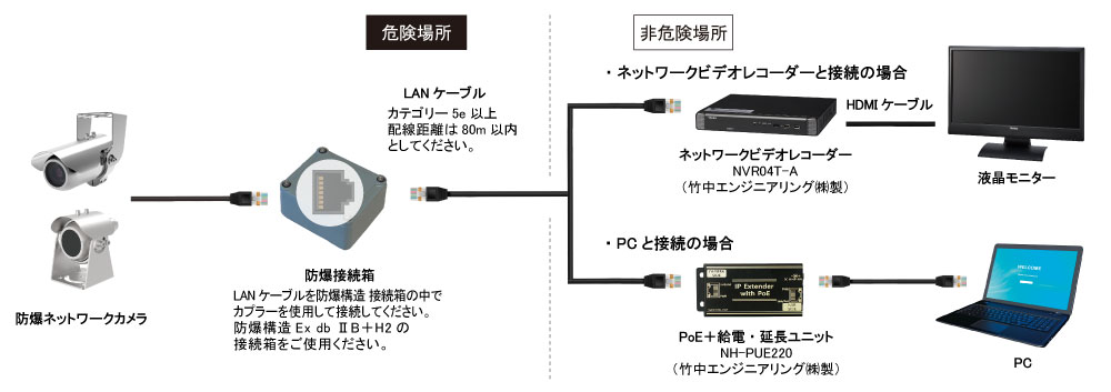SC08・SC002シリーズ 防爆ネットワークカメラ 防爆エリアの遠隔監視を実現 高解像度2メガピクセルCMOSセンサを搭載 フルハイビジョン1920×1080の高精細画像表示を実現。 PoE(Power or Ethernet)給電により、ケーブル1本で電源供給が可能 カメラ側の電源工事が不要。 カラー映像、モノクロ映像を自動で切り替わるデイナイト機能を搭載 筐体に耐食性に優れたSUS316Lと無接点構造を採用 防爆性能:Ex db ⅡC T6 Gb(水素対応) 検定合格番号: 第TC22738X号(TIIS)※SC08・SC08-3 第TC22737X号(TIIS)※SC002 ダウンロード ラインナップ 特長 外形寸法図 アプリケーション オプション SC08・SC002シリーズ ラインナップ 型式 電源 装着レンズ 防爆性能 防爆構造 標準価格(¥) ダウンロード SC08 PoE Class3(DC48V 50mA 2.4W) f=2.7mm F1.4 Ex db ⅡC T6 Gb 耐圧防爆構造 お問い合わせください SC08-3 PoE Class3(DC48V 50mA 2.4W) f=3.4mm F1.4 Ex db ⅡC T6 Gb 耐圧防爆構造 お問い合わせください SC002 PoE Class3(DC48V 90mA 4.0W) f=2.7~12mm 光学4.4倍 F1.4 Ex db ⅡC T6 Gb 耐圧防爆構造 お問い合わせください 特長 システム事例 外形寸法図 SC08・SC08-3 SC002 SC-WB(オプション) 防爆 水素ステーションでの映像監視 水素ステーションでの映像監視 防爆ネットワークカメラ SC08・SC002シリーズ 防爆 設備の遠隔監視 設備の遠隔監視 防爆ネットワークカメラ SC08・SC002シリーズ オプション ブラケット SC-WB 品名 ウォールブラケット 標準価格(¥) お問い合わせください